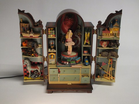 Diese Spieluhr ist zwar aus jüngerer Zeit (90er Jahre), aber da sie sehr aufwändig gearbeitet ist, hat sie doch einigen Wert. Das Spielwerk wird elektrisch angetrieben und es gibt eine Vielzahl an weiteren Funktionen. Wenn man den Schrank öffnet und dann die rechte untere Schublade herauszieht wird die Spieluhr eingeschaltet, die Figuren drehen sich im Tanz, die Eisenbahn fährt im Kreis, der Globus dreht sich, die Laterne leuchtet, im Haus geht das Licht an...