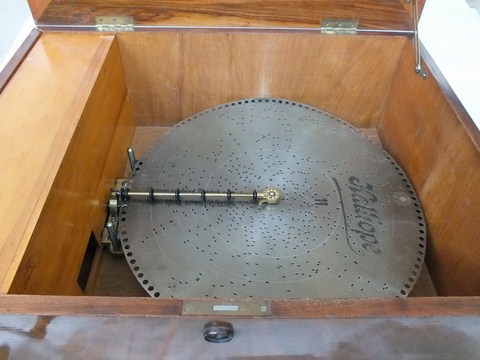 Diese Kalliope Plattenspieluhr ist sozusagen der Vorgänger des Schallplattenspielers. Die Blechscheiben waren einfach austauschbar und man konnte somit eine "Schallplattensammlung" anlegen, denn die Blechscheiben konnten durch stanzen recht kostengünstig gefertigt werden (im Vergleich zu den Walzen) und es gab nun ein großes Angebot an Melodien. Ende des 19. Jahrhunderts gab es in und um Leipzig mehrere Hersteller dieser Spielwerke.