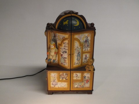 Diese Spieluhr ist zwar aus jüngerer Zeit (90er Jahre), aber da sie sehr aufwändig gearbeitet ist, hat sie doch einigen Wert. Das Spielwerk wird elektrisch angetrieben und es gibt eine Vielzahl an weiteren Funktionen. Wenn man den Schrank öffnet und dann die rechte untere Schublade herauszieht wird die Spieluhr eingeschaltet, die Figuren drehen sich im Tanz, die Eisenbahn fährt im Kreis, der Globus dreht sich, die Laterne leuchtet, im Haus geht das Licht an...